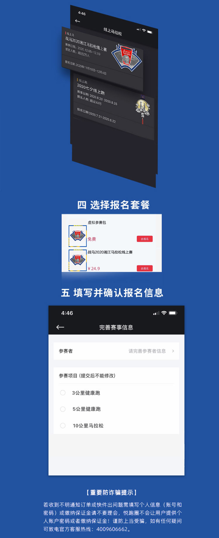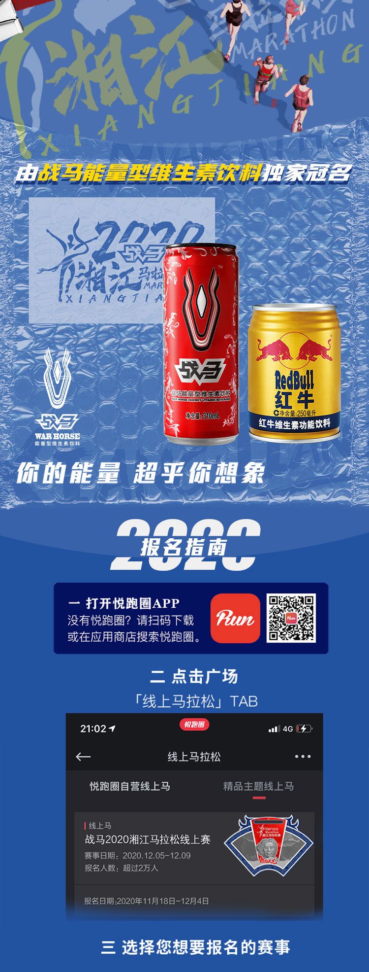 ▶ 报名途径:选手们需登录线上跑官方指定跑步类APP—“悦跑圈”-点击「广场」-「线上马拉松」入口,选择战马2020湘江马拉松线上赛